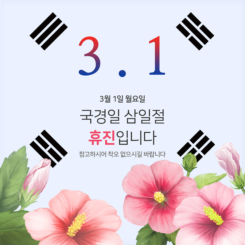 3¿ù 1ÀÏ (¿ù) »ïÀÏÀýÀº ÈÞÁø ÀÔ´Ï´Ù.Âü°íÇÏ½Ã¾î ¿¹¾à ¹× ³»¿ø ½Ã Âø¿À ¾øÀ¸½Ã±æ ¹Ù¶ø´Ï´Ù.